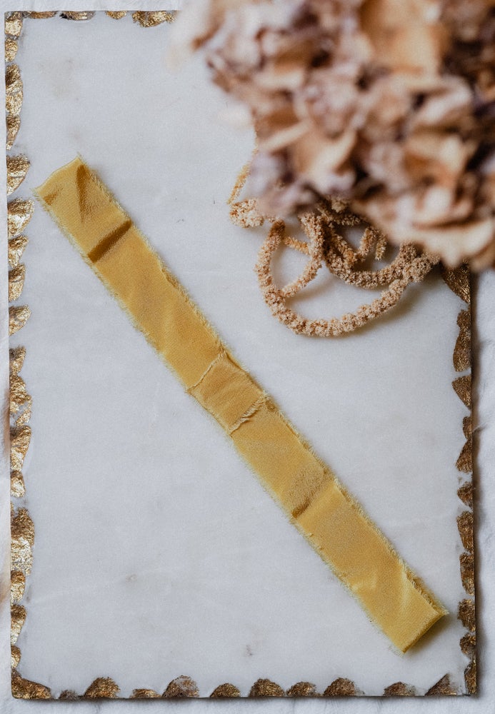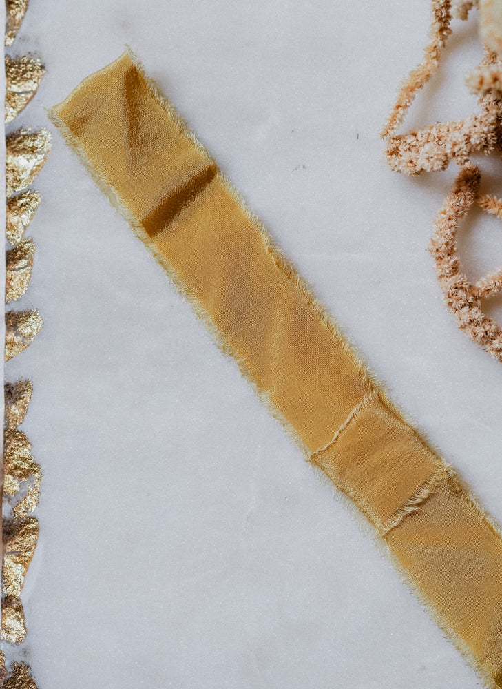 Ruban de crêpe de soie teinté à la main grâce aux végétaux récoltés et travaillés par un atelier spécialisé. Leurs petites mains s'attachent à valoriser les détails, embellir les petites imperfections et laissent la spontanéité prendre le dessus. Chacune de leurs créations est une pièce unique, aux multiples particularités. De légères variations entre chaque pièce peuvent apparaître.