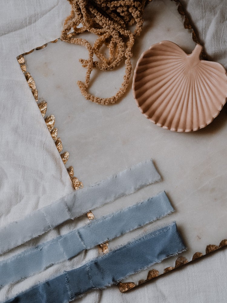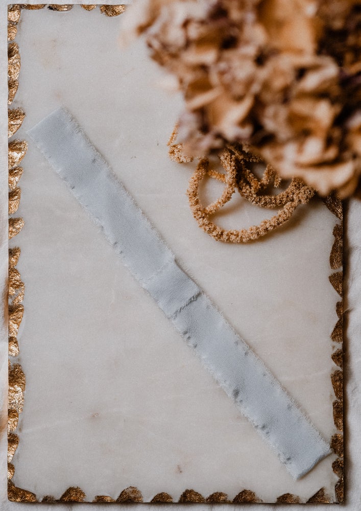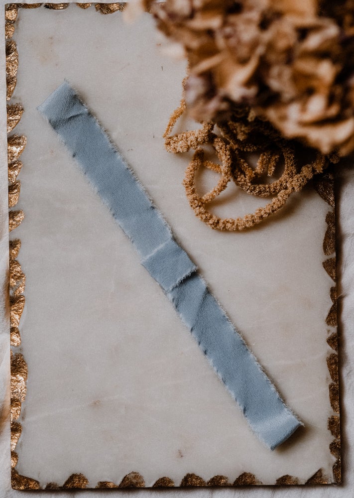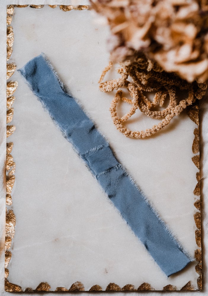 Ruban de crêpe de soie teinté à la main grâce aux végétaux récoltés et travaillés par un atelier spécialisé. Leurs petites mains s'attachent à valoriser les détails, embellir les petites imperfections et laissent la spontanéité prendre le dessus. Chacune de leurs créations est une pièce unique, aux multiples particularités. De légères variations entre chaque pièce peuvent apparaître.